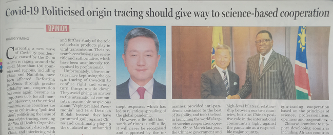 中國駐納米比亞大使在納主流媒體發(fā)文:病毒溯源不應被政治化、污名化、工具化