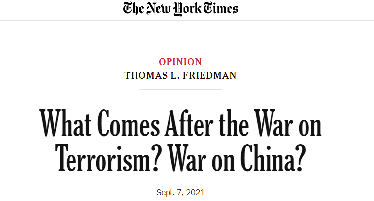 此外,《紐約時報》9月7日刊發(fā)著名專欄作家托馬斯·弗里德曼的評論稱,別輕易從反恐戰(zhàn)爭轉(zhuǎn)向“對華戰(zhàn)爭”,讓我們認真思考一下。我們的子孫會在2041年感謝我們。