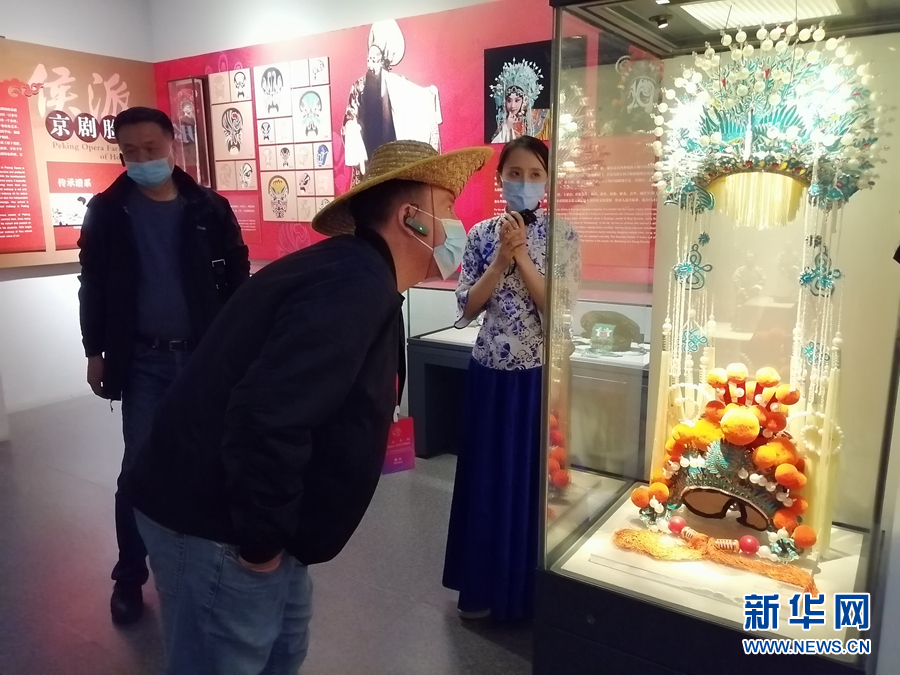 10月21日,“中國有約”2021年國際媒體主題采訪記者團一行來到天津市,探訪坐落于和平區(qū)民園廣場二層的非物質(zhì)文化遺產(chǎn)展覽博物館。圖為一位外籍記者在許氏戲曲盔頭制作技藝的實物前凝神觀看。新華網(wǎng)記者 侯強 攝