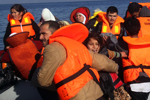 2015年11月8日,來自敘利亞和阿富汗的難民乘坐小船抵達(dá)希臘的萊斯沃斯島。新華社發(fā)(馬里奧斯·羅洛斯攝)