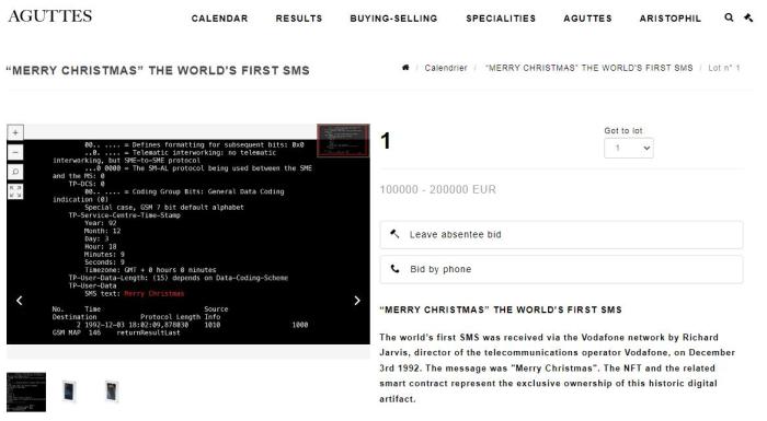 這條具有里程碑意義的短信,將以數(shù)字復(fù)制品的形式,在12月21日于巴黎被拍賣。承擔(dān)此次拍賣的法國阿古特(Aguttes)拍賣行目前已經(jīng)將該商品掛在其網(wǎng)站上,并為其預(yù)估了成交價,預(yù)計為10萬至20萬歐元。