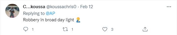 對于美國的這一決定,很多網(wǎng)友也直接斥之為搶劫。網(wǎng)友C...koussa在美聯(lián)社的報道下留下了“光天化日之下?lián)尳佟钡脑u論。