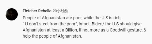 網(wǎng)友Flecher Rebello稱,“阿富汗人民貧窮,而美國富有。你們不要偷窮人的了。實際上,拜登或者美國應(yīng)該給阿富汗最少10億(美元),幫幫阿富汗人”。