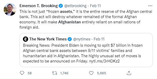 網(wǎng)友Emerson T. Brooking指出,這不僅僅是“凍結(jié)資產(chǎn)”,它是阿富汗中央銀行的全部儲備。這一決定將使阿富汗完全依賴于少量的外國援助。