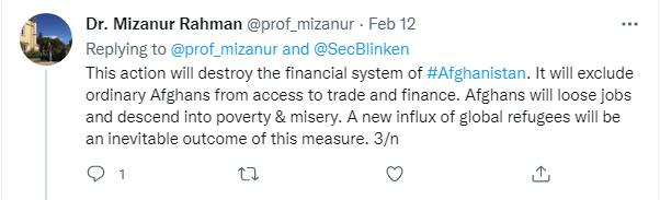 網(wǎng)友Dr. Mizanur Rahman認(rèn)為,這一行動將摧毀阿富汗的金融體系。它將把普通阿富汗人排除在貿(mào)易和金融之外。阿富汗人將失去工作,陷入貧窮和痛苦。