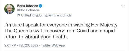 20日,英國女王新冠陽性,英國首相約翰遜在社交媒體發(fā)文祝愿她早日康復。圖片來源:英國首相社交媒體官方賬號截圖。