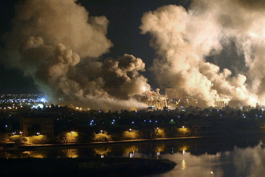 這是2003年3月21日,在美軍的空中打擊下,伊拉克首都巴格達(dá)的總統(tǒng)府硝煙彌漫。(新華社發(fā))