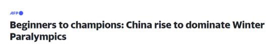 法新社(AFP)報(bào)道贊嘆中國(guó)參加冬殘奧會(huì)20年來“取得了驚人的成功”,“已經(jīng)成為新崛起的冬殘奧會(huì)強(qiáng)國(guó)”。該報(bào)道援引拉夫堡大學(xué)運(yùn)動(dòng)心理學(xué)研究員薩拉·斯沃博達(dá)(Sara Svoboda)的話表示,中國(guó)隊(duì)的強(qiáng)勁表現(xiàn)是整個(gè)冬殘奧會(huì)團(tuán)隊(duì)為了一致目標(biāo)共同努力的結(jié)果。