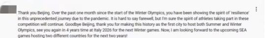 感謝北京。冬奧會(huì)開賽一個(gè)月來,你們展現(xiàn)了“堅(jiān)韌不拔”的精神。難說再見,我相信運(yùn)動(dòng)員在比賽中的精神將永遠(yuǎn)延續(xù)。再見了北京,感謝你創(chuàng)造歷史,成為首個(gè)既舉辦過夏奧會(huì)又舉辦過冬奧會(huì)的“雙奧之城”。4年后,在意大利2026年冬奧會(huì)見。現(xiàn)在,我期待兩年后在東南亞兩個(gè)國(guó)家舉辦的東南亞運(yùn)動(dòng)會(huì)。