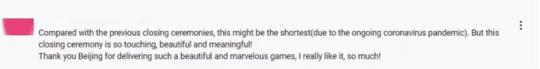 與此前的閉幕式相比,這可能是(時(shí)長(zhǎng))最短的(受新冠肺炎疫情影響)。但是這次閉幕式如此動(dòng)人、美妙、充滿意義。感謝北京帶來了如此美妙非凡的體育盛會(huì)。我真的非常喜歡。