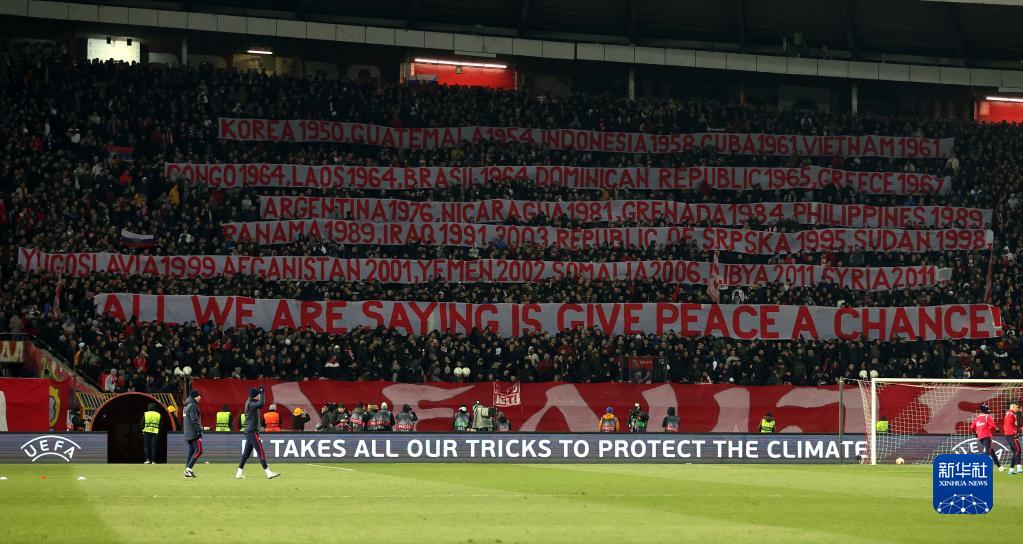 在17日舉行的2021-2022賽季歐羅巴聯(lián)賽八分之一決賽次回合比賽、貝爾格萊德紅星隊(duì)對戰(zhàn)蘇格蘭格拉斯哥流浪者隊(duì)的比賽中,塞爾維亞觀眾拉起6條大型橫幅。首行橫幅引用英國已故知名音樂人約翰·列儂創(chuàng)作的反戰(zhàn)歌曲《給和平一個(gè)機(jī)會(huì)》中一句歌詞:“我們想說的是,給和平一個(gè)機(jī)會(huì)!