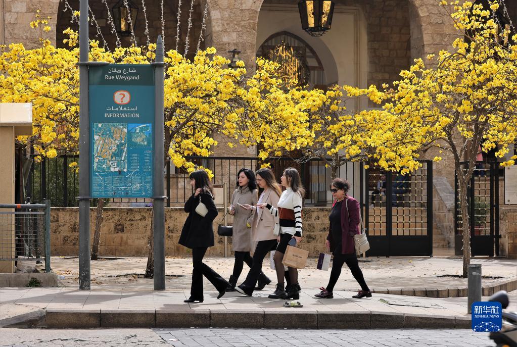 3月31日,在黎巴嫩貝魯特,人們從盛開(kāi)的黃花風(fēng)鈴木旁走過(guò)。