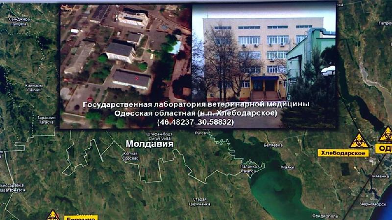 這張俄國防部3月17日提供的視頻截圖顯示的是,俄軍輻射、化學(xué)和生物防護部隊司令基里洛夫在俄羅斯莫斯科舉行的吹風(fēng)會上展示的美在烏境內(nèi)開展生物軍事項目的相關(guān)信息。新華社/衛(wèi)星社