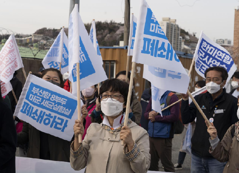 2022年4月5日,韓國民間團體在韓國釜山的美軍基地附近游行示威,呼吁停止韓美聯(lián)合軍事演習(xí),要求關(guān)閉釜山港美軍基地內(nèi)的生物實驗設(shè)施。李相浩攝