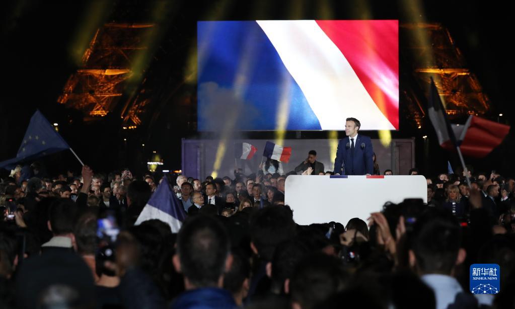 4月24日,法國現(xiàn)任總統(tǒng)馬克龍在巴黎出席選舉后的慶祝集會。新華社記者 高靜 攝