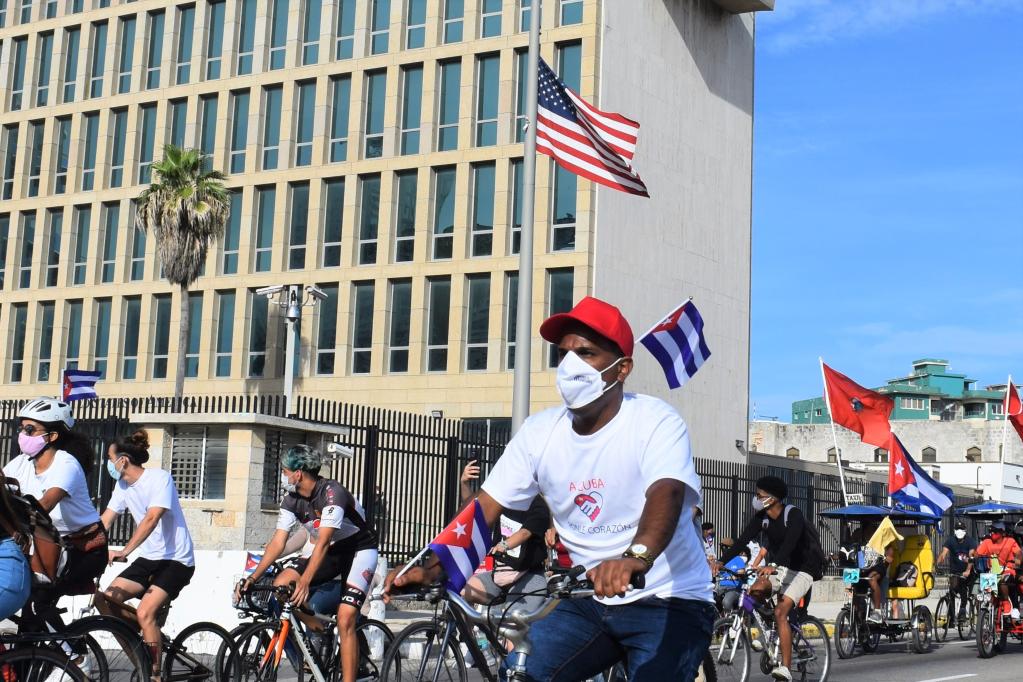 2021年8月5日,在古巴首都哈瓦那,游行隊(duì)伍經(jīng)過美國(guó)駐古巴大使館。新華社記者朱婉君攝