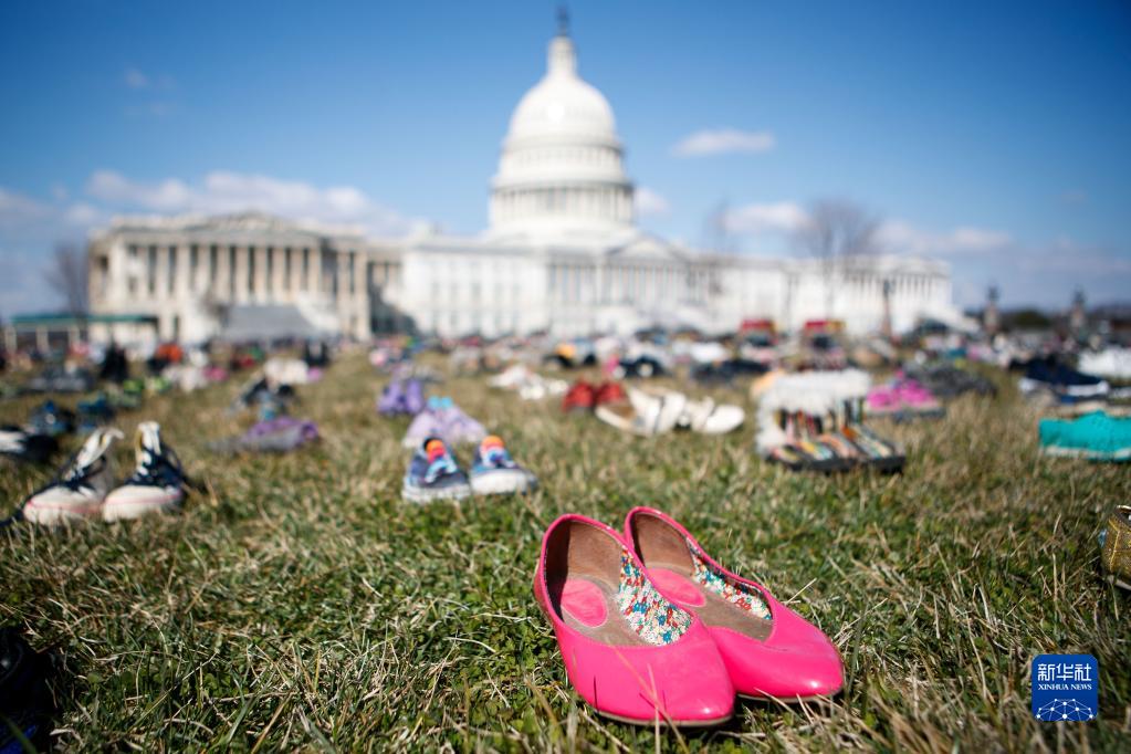 2018年3月13日,7000雙代表自2012年美國康涅狄格州桑迪胡克小學(xué)槍擊案以來槍擊事件中遇難兒童的鞋子擺放在華盛頓國會山前的草坪上。人們以這種無聲的方式,抗議國會面對槍擊頻發(fā)現(xiàn)狀的不作為,呼吁槍支改革以保障兒童安全。新華社發(fā)(沈霆攝)