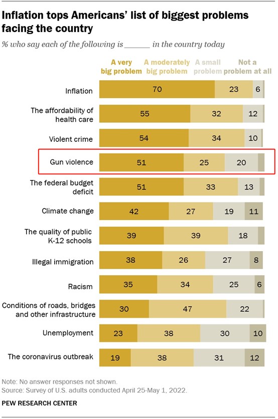 皮尤研究中心2022年4月進行的調(diào)查顯示,有76%的美國人認為槍支暴力已成為美國面臨的“很嚴重或比較嚴重的問題”。圖片來源:皮尤研究中心網(wǎng)站截圖