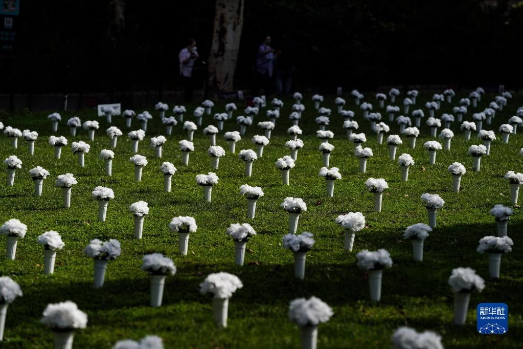這是2021年10月8日在美國紐約炮臺公園內(nèi)拍攝的為悼念槍支暴力遇難者擺放的白色瓶花。據(jù)主辦方介紹,這個由1050個白色瓶花組成的大型紀念裝置旨在悼念2020年在紐約州死于槍支暴力的1050名受害者,呼吁政府針對槍支暴力采取行動。新華社記者 王迎 攝