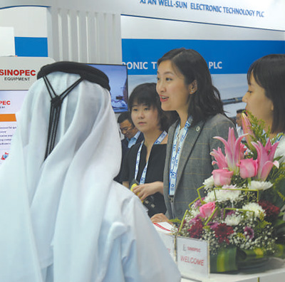 在阿聯(lián)酋阿布扎比國際石油展上,中方工作人員向外國客商介紹易派客平臺。