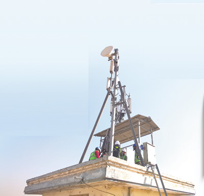 中國移動辛姆巴科公司工作人員在高溫下開展4G基站建設(shè)。