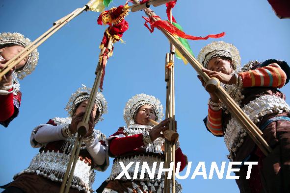 資料圖片:11月6日,身著節(jié)日盛裝的苗族婦女吹蘆笙。當天是農歷九月二十七,在貴州省黃平縣谷隴鎮(zhèn),來自凱里、黃平、施秉、麻江等地的數(shù)萬苗族同胞身著節(jié)日盛裝,歡度一年一度的傳統(tǒng)蘆笙會。新華社發(fā)(秦剛 攝)