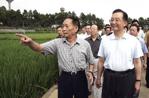 2007年8月11日至14日,中共中央政治局常委、國務(wù)院總理溫家寶先后到安徽、湖南的企業(yè)、農(nóng)村、學(xué)校、社區(qū)調(diào)研,與當(dāng)?shù)馗刹咳罕娮,共商促進(jìn)中部崛起大計(jì)。這是8月13日,溫家寶在湖南長沙國家雜交稻研究中心的試驗(yàn)田邊,聽取“雜交水稻之父”袁隆平院士介紹雜交稻研究情況。(新華社記者姚大偉 攝)