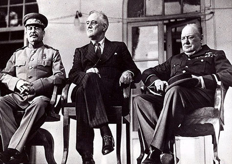資料圖片:二戰(zhàn)時期的斯大林(左)羅斯福(中)與丘吉爾。