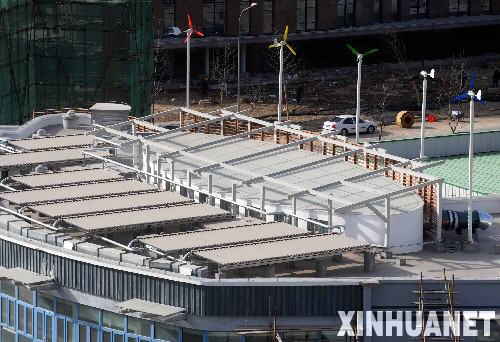 2008年奧運(yùn)會期間,供各國運(yùn)動員、教練員等相關(guān)人員住宿的奧運(yùn)村所用的可再生能源利用設(shè)備系統(tǒng)將從再生水熱泵冷熱源以及太陽能中獲取789萬千瓦時的能量用于空調(diào)制冷和生活熱水,節(jié)約標(biāo)煤3077噸,相當(dāng)于減排二氧化碳8000噸。圖為2月28日拍攝的安裝在奧運(yùn)村內(nèi)屋頂上的風(fēng)力發(fā)電機(jī)。 新華社記者羅曉光攝