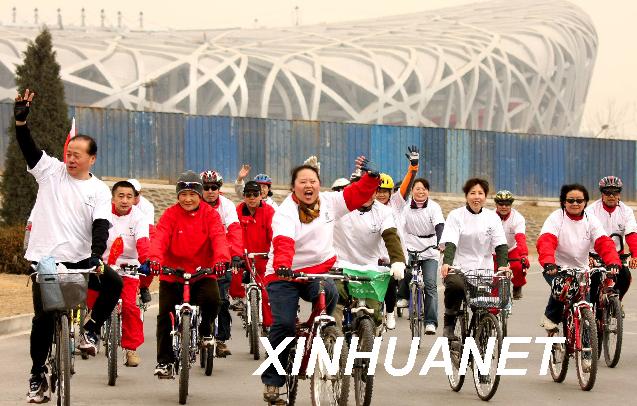 3月1日,自行車愛好者到達(dá)國家體育場“鳥巢”。當(dāng)日,來自北京市各區(qū)縣的500多名自行車愛好者在北京市自行車運(yùn)動(dòng)協(xié)會的組織下,從先農(nóng)壇體育場出發(fā),參加“綠色騎行”活動(dòng)。新華社發(fā)(李慧 攝)
