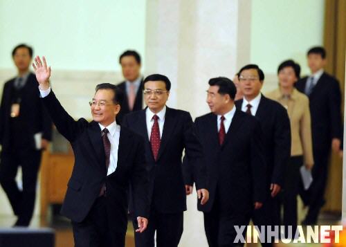 3月18日,國(guó)務(wù)院總理溫家寶和副總理李克強(qiáng)、回良玉、張德江、王岐山在北京人民大會(huì)堂與中外記者見面,并回答記者提問(wèn)。 新華社記者李學(xué)仁攝