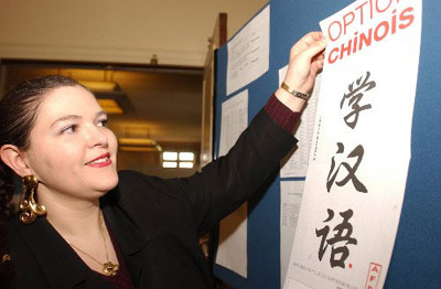 2004年3月26日,在法國首都巴黎舉行的全法漢語教學研討會場外,一名工作人員在張貼本次研討會的布告。 (來源:中法文化年委員會)