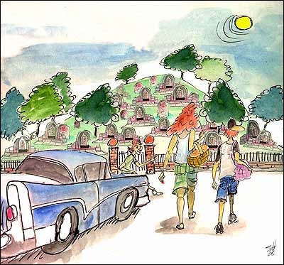 中國式的墓地設計得非常舒適,像一張超大的半圓型扶手椅。許多人會在墓前焚香燒紙。至于那些花花綠綠的鈔票,我們猜那是陰間的鈔票,專門為死者設計的。我們還看見有家人在墓旁生起了篝火,母親帶著裝得滿滿的包,里面肯定是裝滿了吃的東西——或許是烤肉吧?在墓前還放了一些蛋糕,幾瓶啤酒和白酒。