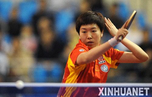 5月3日,李曉霞在女子組單打比賽中以3比0戰(zhàn)勝范瑛。當(dāng)日,中國乒乓球超級(jí)明星熱身賽在山西省太原市濱河體育中心舉行,這是中國乒乓球隊(duì)備戰(zhàn)北京奧運(yùn)會(huì)而進(jìn)行的“以賽代練”。 新華社記者江宏景攝
