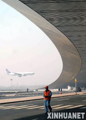 一架飛機(jī)從即將開(kāi)航運(yùn)營(yíng)的3號(hào)航站樓旁掠過(guò)(2月19日攝)。 新華社記者羅曉光攝
