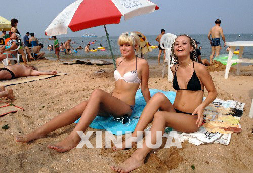 2007年8月9日,兩位來自俄羅斯莫斯科的游客在北戴河海濱沙灘上休息。新華社記者何俊昌攝