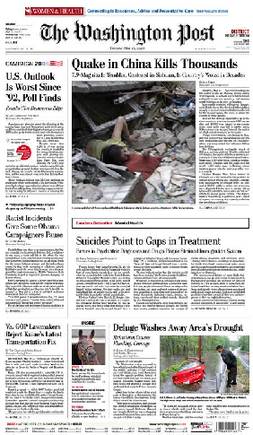 美國(guó)《華盛頓郵報(bào)》頭版:中國(guó)大地震死亡數(shù)千人