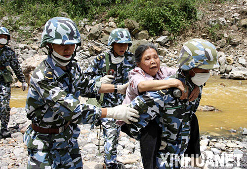 5月18日,海軍陸戰(zhàn)隊戰(zhàn)士在轉移受災群眾。 新華社記者 查春明 攝