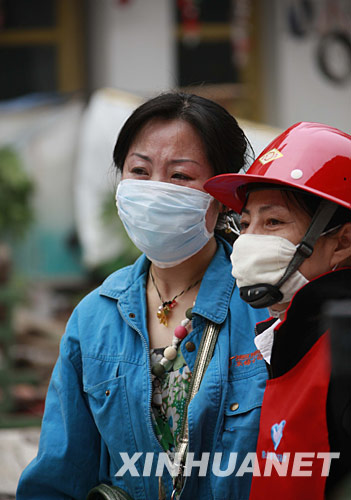 5月18日,一名受困者親屬(左)在綿竹市漢旺鎮(zhèn)搜救現(xiàn)場守候。