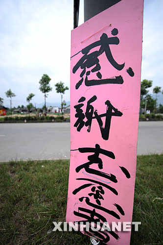 5月19日,一塊寫(xiě)有“感謝志愿者”的木牌被豎在路中央的隔離帶上。綿竹地震災(zāi)區(qū)部分受災(zāi)群眾自發(fā)在路邊豎起“感謝牌”,表達(dá)對(duì)各界援救的感激。 新華社記者王建華攝