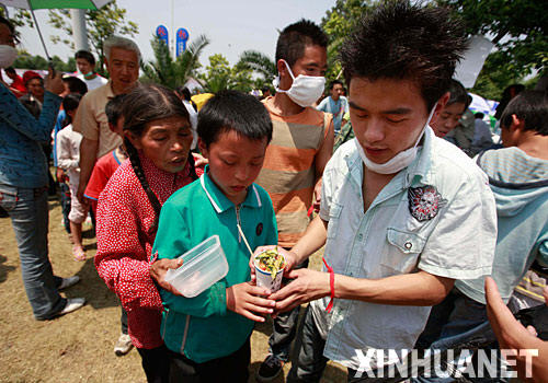 5月19日,一名志愿者在給受災(zāi)群眾分發(fā)食物。在綿陽(yáng)九洲體育館內(nèi)外活躍著近千名志愿者,他們每天工作十幾個(gè)小時(shí),全心全意幫助受災(zāi)群眾。 新華社記者 裴鑫 攝