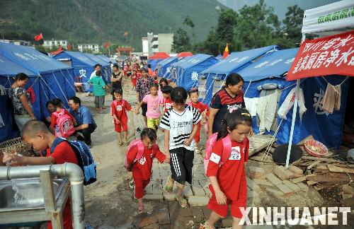 6月2日,北川縣擂鼓鎮(zhèn)放學(xué)的孩子走在回“家”的路上。 他們從各個(gè)地方匯聚到這里,或許以前并不相識(shí),但是苦難讓他們走到一起,成為鄰居,成為朋友。房屋倒了,家園沒(méi)了,但是生活依然要繼續(xù)。安置點(diǎn)的帳篷密密麻麻,儼然成為了一個(gè)村落,整齊的帳篷,整齊的街道,共同從地震中走過(guò)來(lái)的人們……;蛟S明天他們要分開(kāi),相濡以沫的情分卻不會(huì)忘卻。他們?cè)跁簳r(shí)的漂泊中期待著重建自己美麗的家園。 新華社記者 郝同前 攝