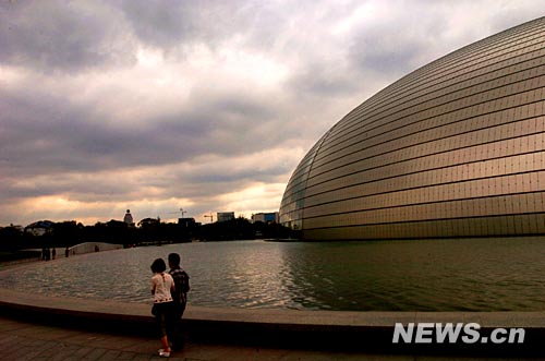 天安門廣場西面的國家大劇院就像一個擱淺在人工湖中的飛碟,這里白天對外開放參觀。盡管票價40元,參觀者的熱情仍舊很高。保羅·安德魯繼承了巴黎機場的設計原則:一個摩天外殼覆蓋著一座真正的“城市”。