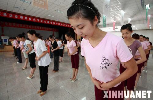 7月23日,奧運(yùn)禮儀小姐們在進(jìn)行頒獎禮儀動作訓(xùn)練。 新華社記者魏培全攝