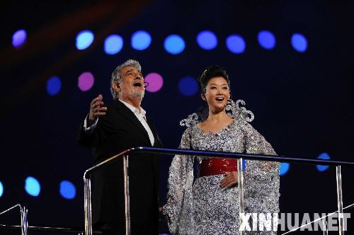 在大約兩小時(shí)的演出中,中國組織者令國家體育場(chǎng)的9萬名觀眾眼花繚亂。多明戈與宋祖英聯(lián)袂演唱;雜技演員踩著彈簧高蹺在場(chǎng)中跳躍;巨大的鼓和鼓手懸浮在空中;歡呼雀躍的運(yùn)動(dòng)員自行入場(chǎng),手中還揮舞著世界各地的國旗。
