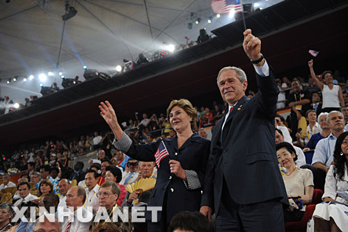 8月8日,美國(guó)總統(tǒng)布什和夫人在北京奧運(yùn)會(huì)開幕式上向運(yùn)動(dòng)員致意。新華社記者趙鵬 攝