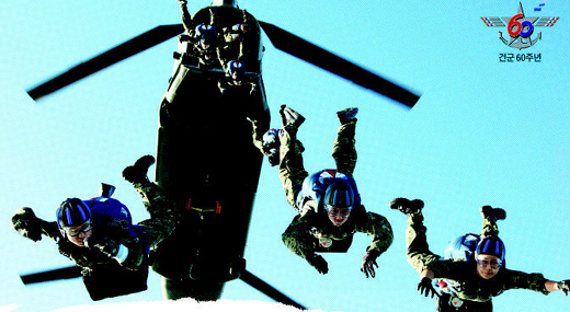 在忠清南道雞龍市一帶舉行的陸軍節(jié)活動中,游客們紛紛駐足仰望天空。天空中形形色色的降落傘不斷降落,正確地降落在同一個地點(diǎn)。為了向國民展示陸軍的強(qiáng)大軍容,作為陸軍節(jié)活動的一個環(huán)節(jié),這里正在舉行第32屆特戰(zhàn)司令官杯高空跳傘大賽。