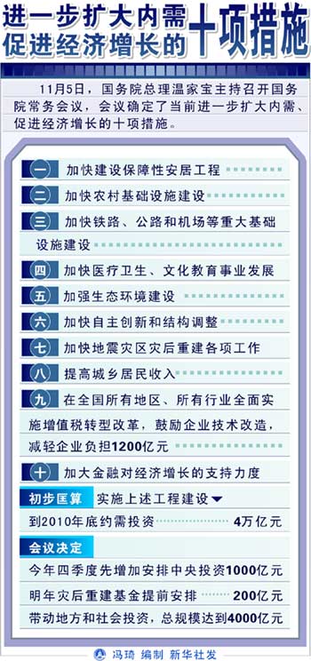 在世界金融危機(jī)日趨嚴(yán)峻的背景下,為抵御國際經(jīng)濟(jì)環(huán)境對中國的不利影響,中國國務(wù)院11月5日召開會議,提出實(shí)行積極的財(cái)政政策和適度寬松的貨幣政策,出臺10項(xiàng)更加有力的擴(kuò)大國內(nèi)需求的措施。