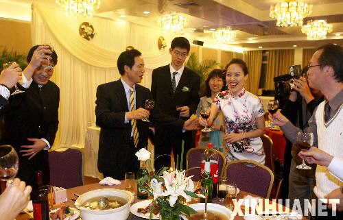 上海一對新人在婚宴上向來賓敬酒(11月1日攝)。 據(jù)國家統(tǒng)計(jì)局上海調(diào)查總隊(duì)最新數(shù)據(jù)顯示,2008年前三個(gè)季度,上海市城市居民家庭人均可支配收入突破2萬元,達(dá)20257元,居全國首位,同比增長13.6%,其中,工資性收入是推動可支配收入增長的主要因素。 新華社記者 張明 攝