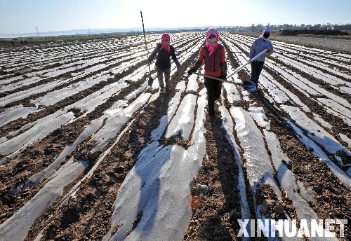 寧夏固原市原州區(qū)開城鎮(zhèn)深溝村村民在田間進(jìn)行覆膜保墑作業(yè)(11月7日攝)。 新華社記者 王鵬 攝